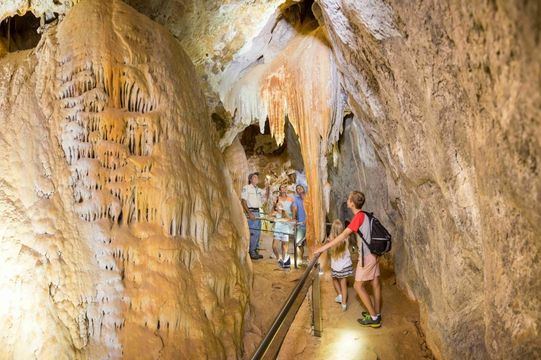 Guided tours through limestone caves, plus ruins of the old smelter site.